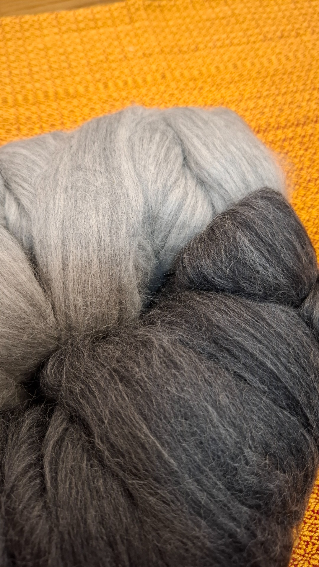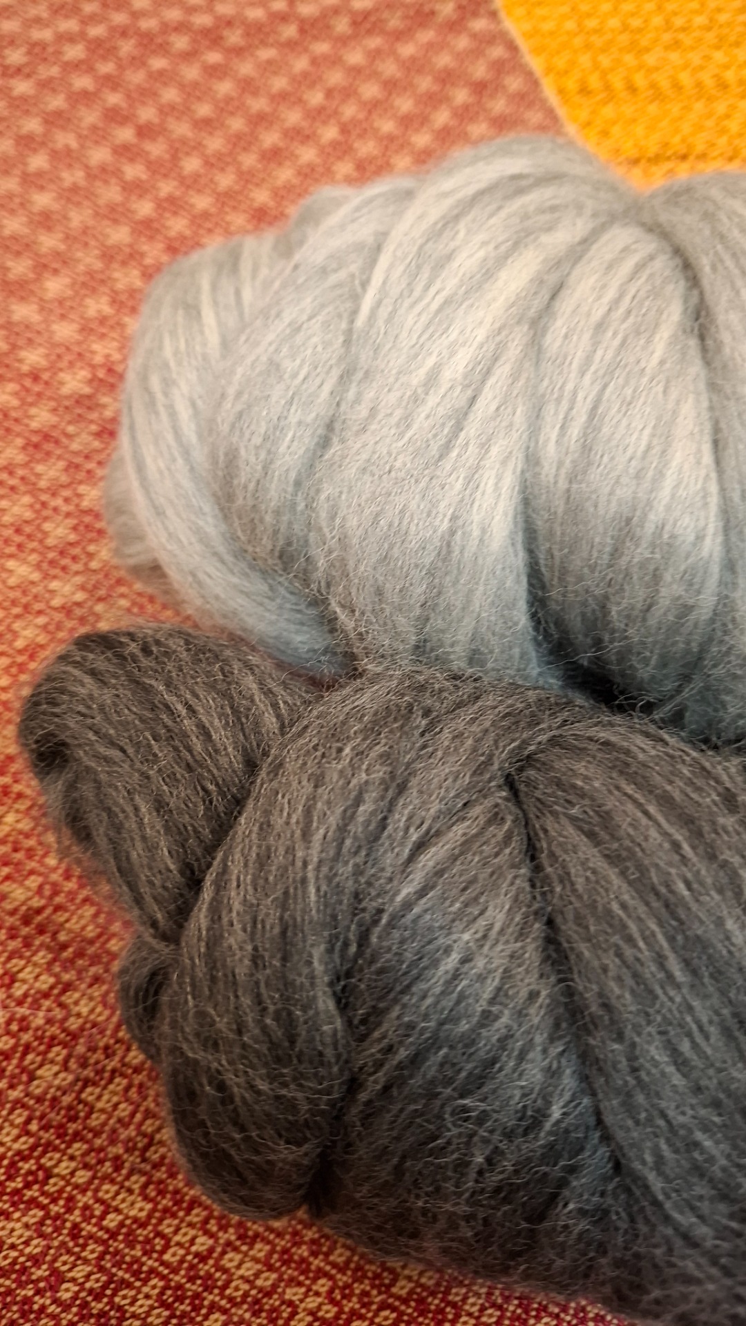 Dva šedé odstíny dávají při spřádání nádherný melírový nebo gradientní efekt – stačí střídat prameny, míchat je v rukách nebo vrstvit při navíjení. Skvělé pro předení měkké příze na svetry, šály nebo rukavice.