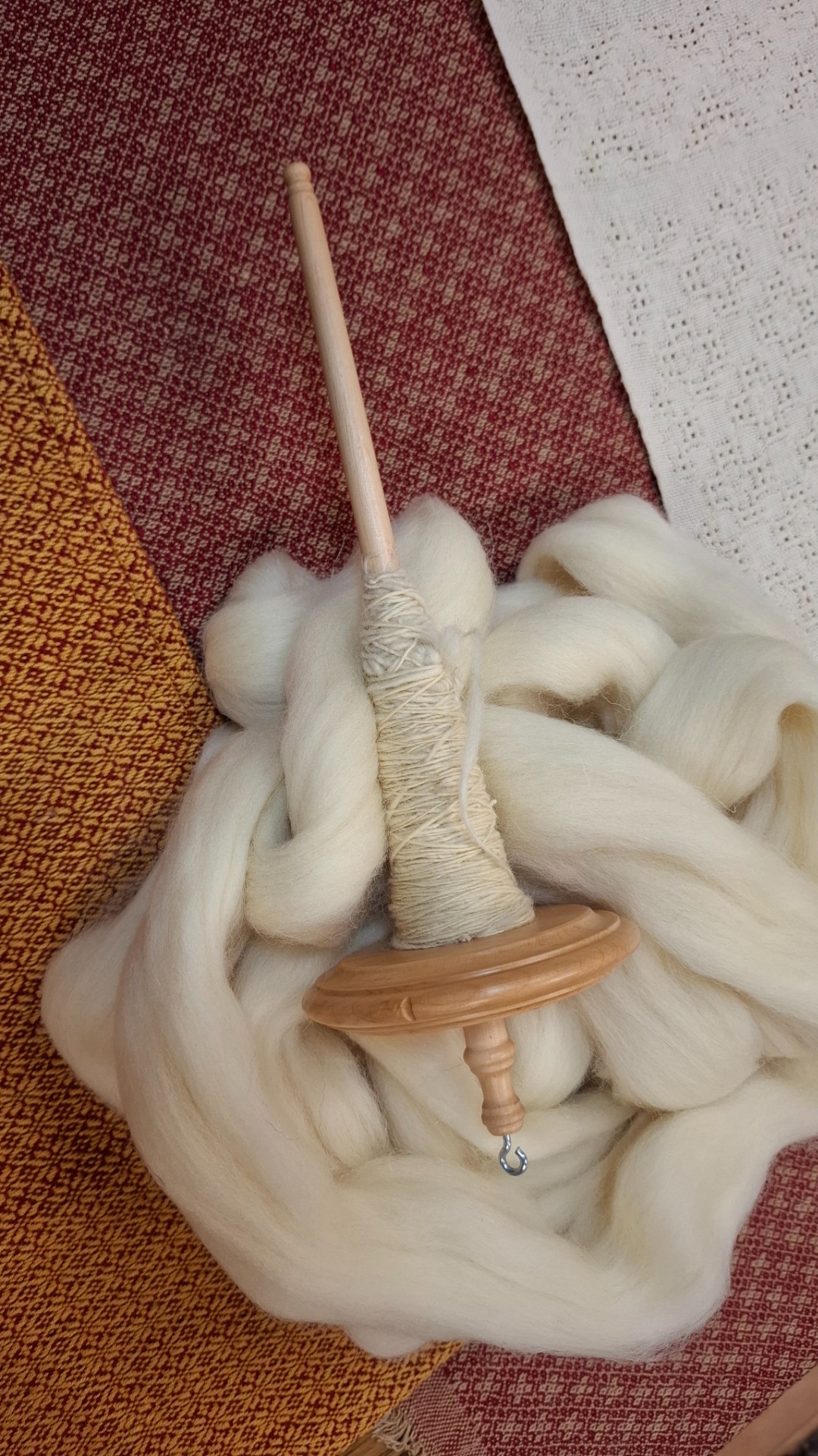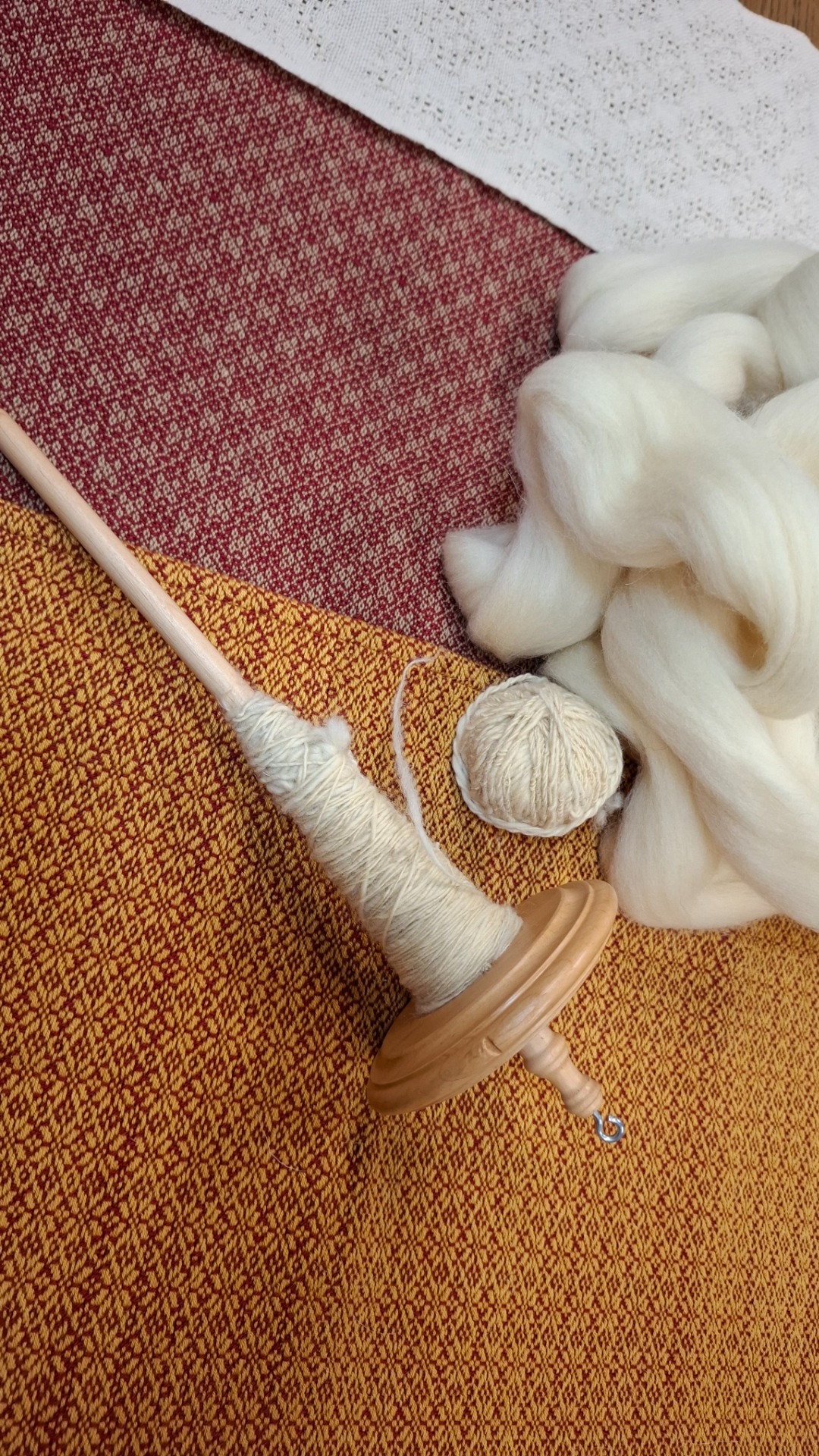 Vřeteno je lehké, vyvážené a krásně padne do ruky, vlna měkká a odpouštějící – ideální partnerka pro první pokusy i malé úspěchy.